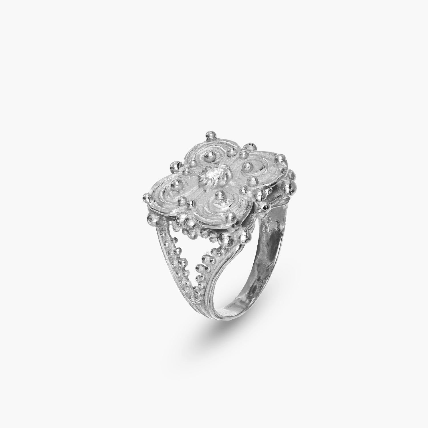 Questo anello nasce dall’incontro tra il simbolo del quadrifoglio e la purezza dell’oro bianco, trasformando un segno di buon auspicio in una presenza luminosa e silenziosa. Le quattro foglie prendono forma attraverso linee morbide e piccoli rilievi che sembrano disegnati dalla luce stessa, creando un gioco delicato di riflessi e ombre.