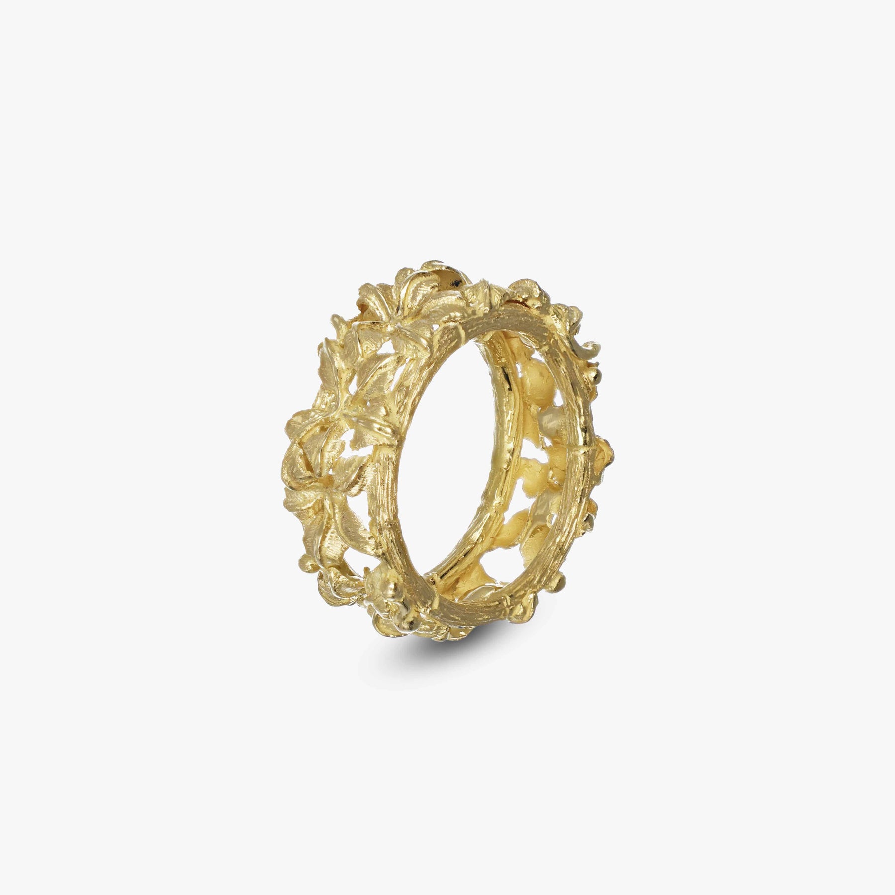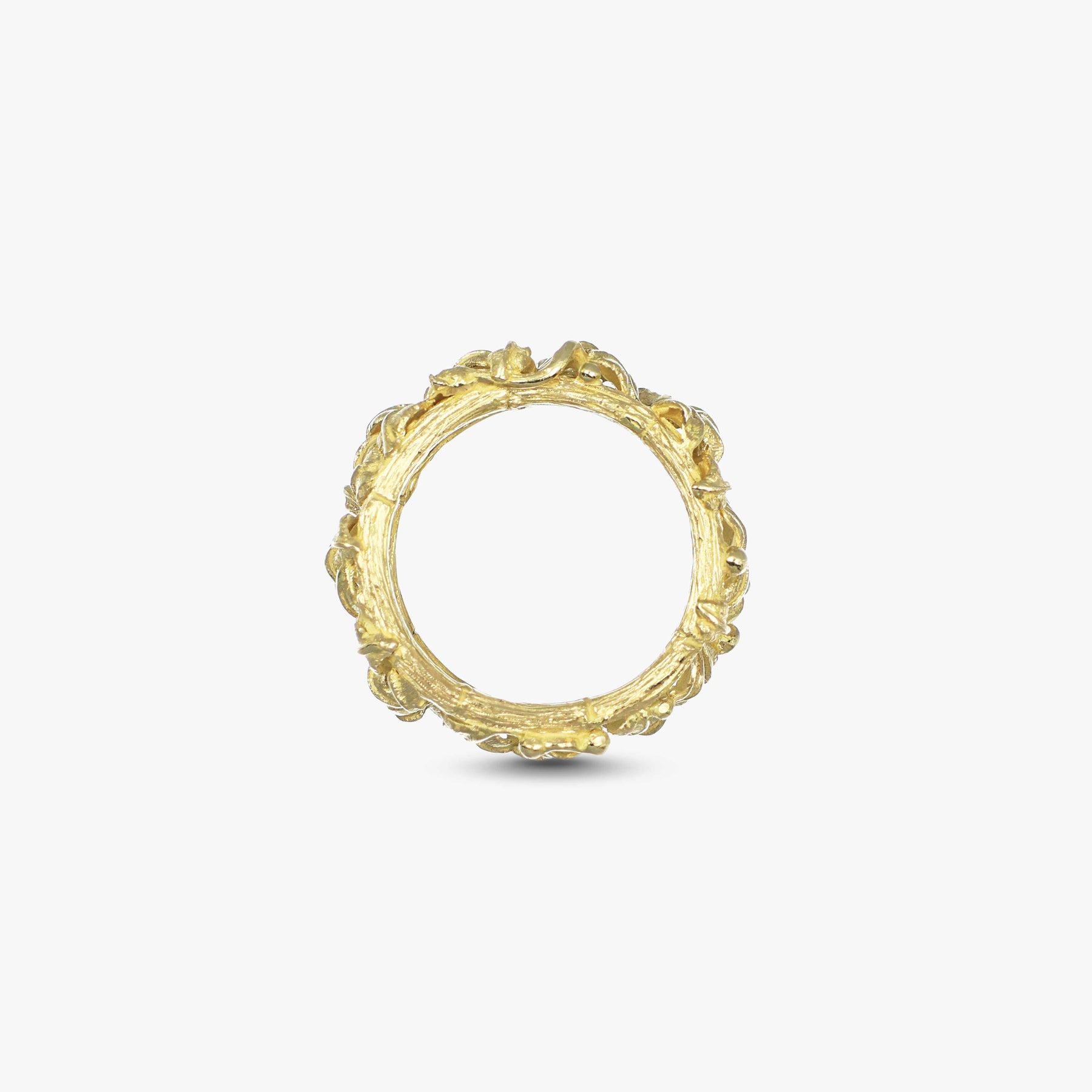 L’Anello Edera in oro giallo nasce dall’osservazione della natura che cresce lentamente, si intreccia e resiste al tempo. Le foglie di edera avvolgono l’anello in modo continuo, creando un disegno organico e fluido che sembra modellato dal movimento stesso della pianta.