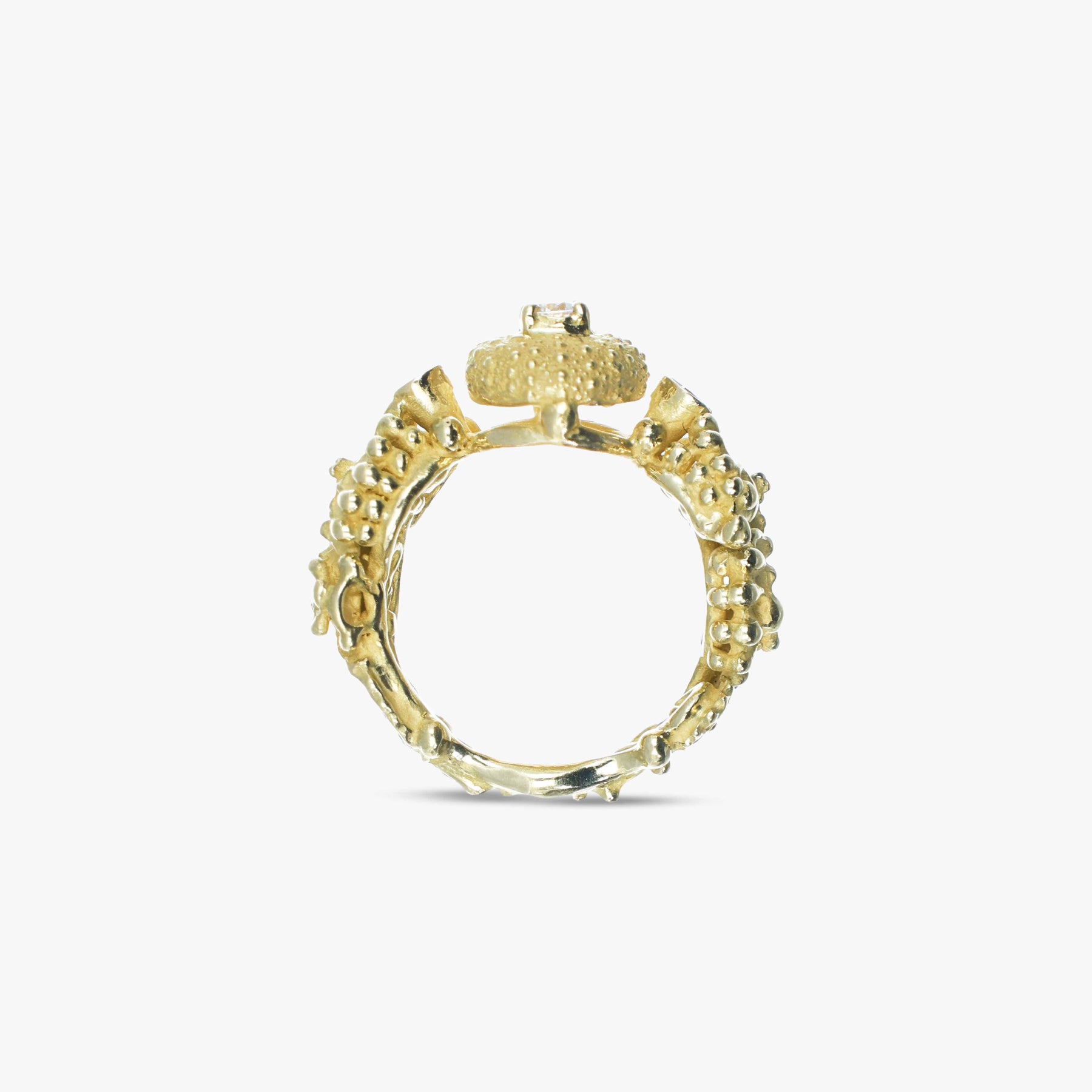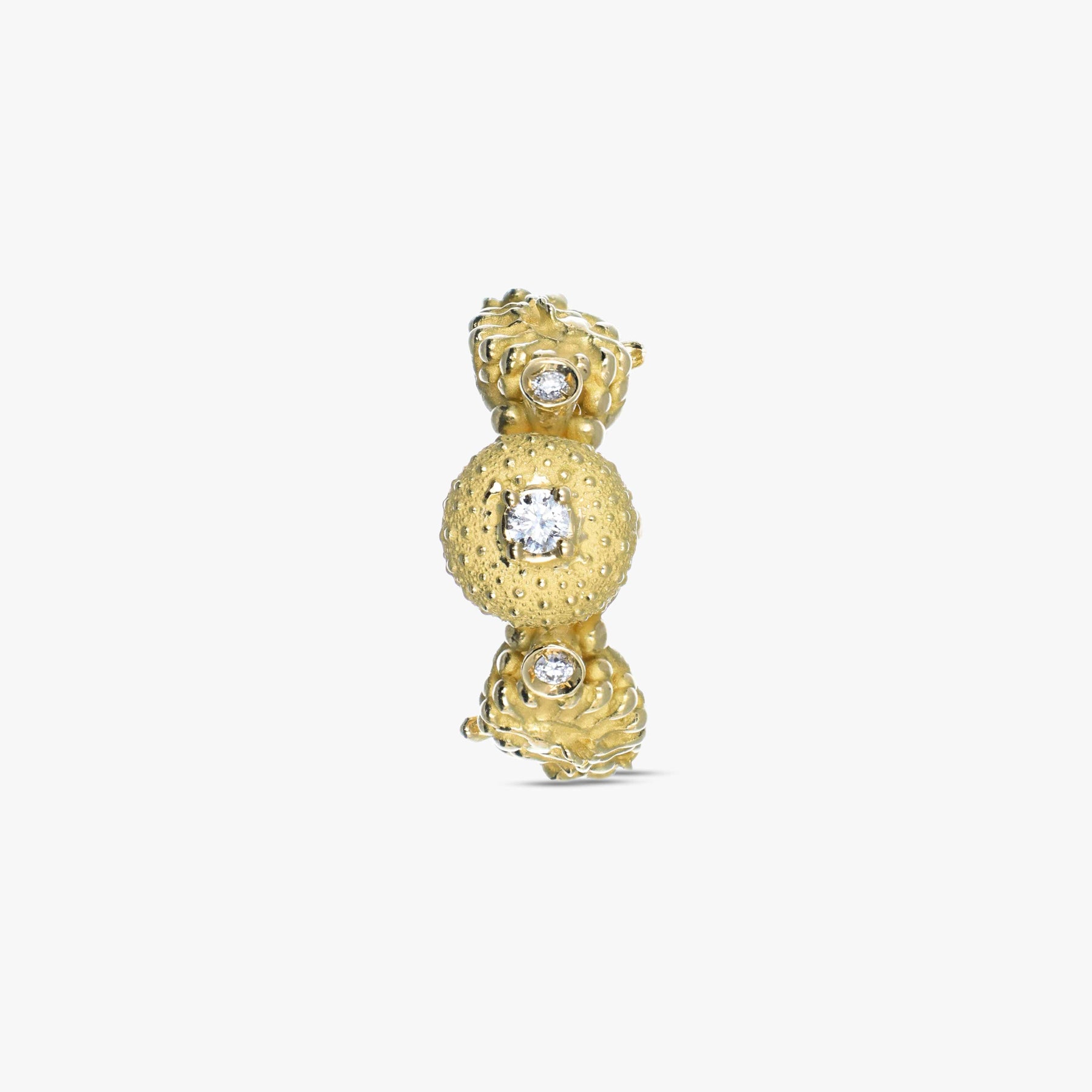 Questo anello nasce dall’osservazione del riccio di mare, una presenza silenziosa e forte, scolpita dal tempo e dall’acqua. L’oro giallo 18kt ne interpreta la forma con una luce calda e profonda, mettendo in risalto le superfici irregolari e i dettagli scolpiti a mano.