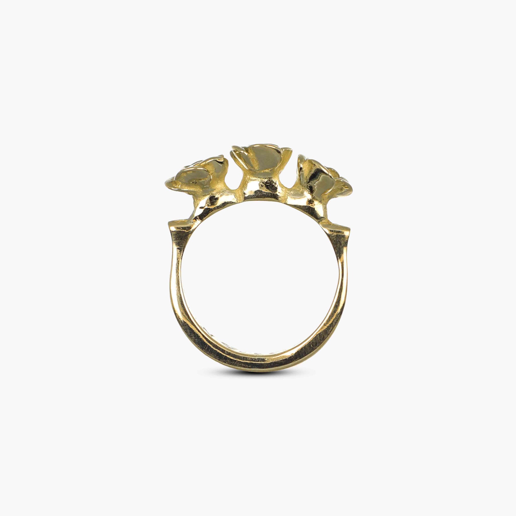 Tre rose che sbocciano sotto una luce piena, calda, viva. L’Anello Rose in oro giallo racconta un giardino illuminato dal sole di mezzogiorno. Le forme restano morbide e naturali, con petali scolpiti che sembrano appena mossi dall’aria. Le tre rose si susseguono con equilibrio lungo la parte superiore dell’anello, creando una presenza luminosa ma armoniosa.