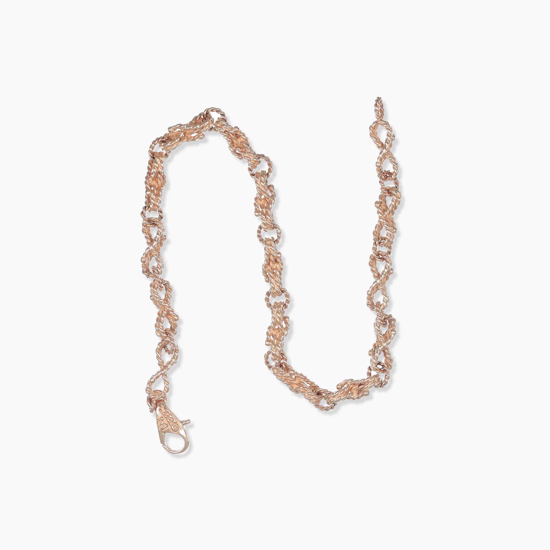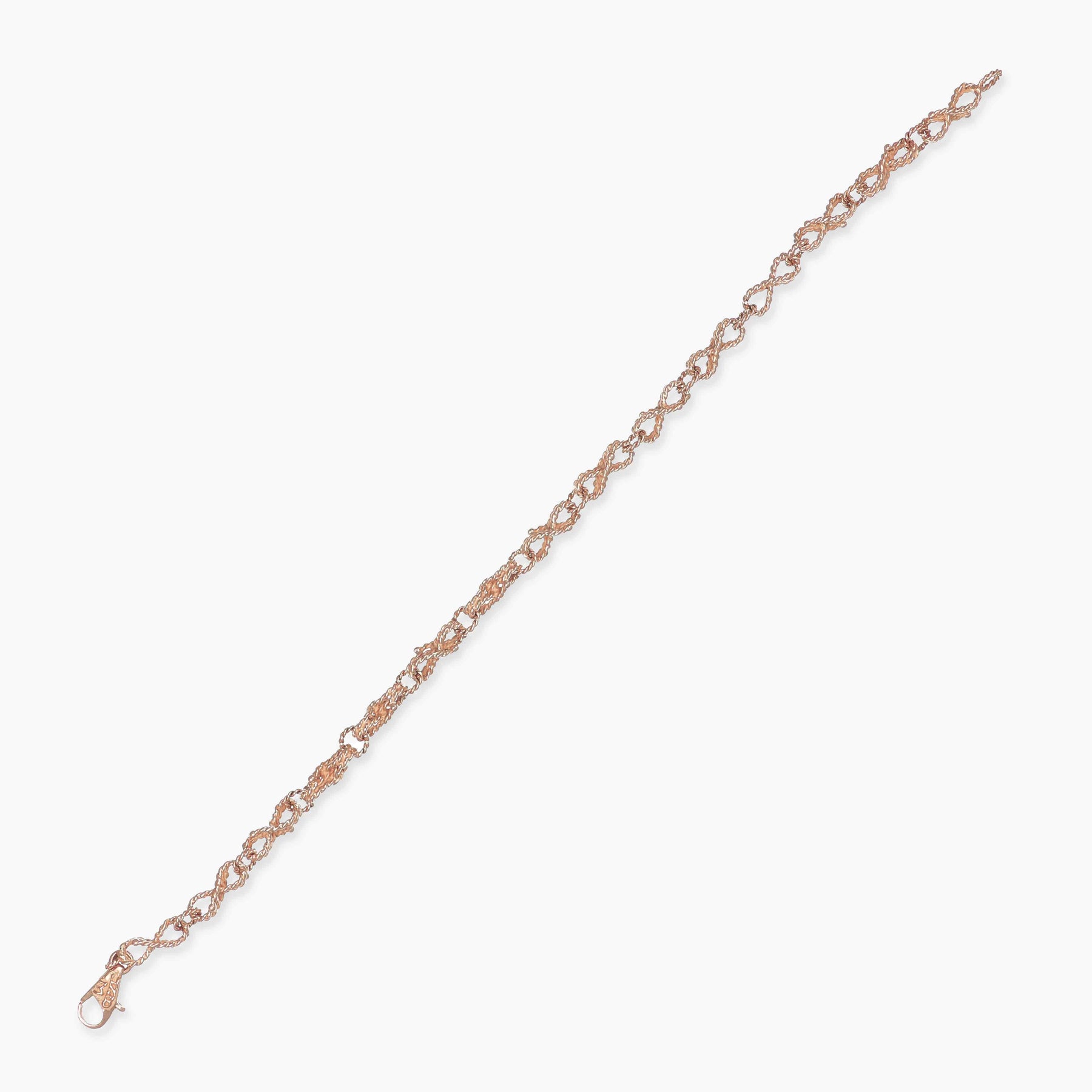 Questo Bracciale Infinito in oro rosa 18kt avvolge il polso con una luce morbida e profonda. Le maglie si intrecciano in un disegno continuo che richiama il simbolo dell’infinito senza dichiararlo apertamente. Il suo riflesso ricorda il tramonto, quando la luce si fa più calda e il tempo sembra rallentare.