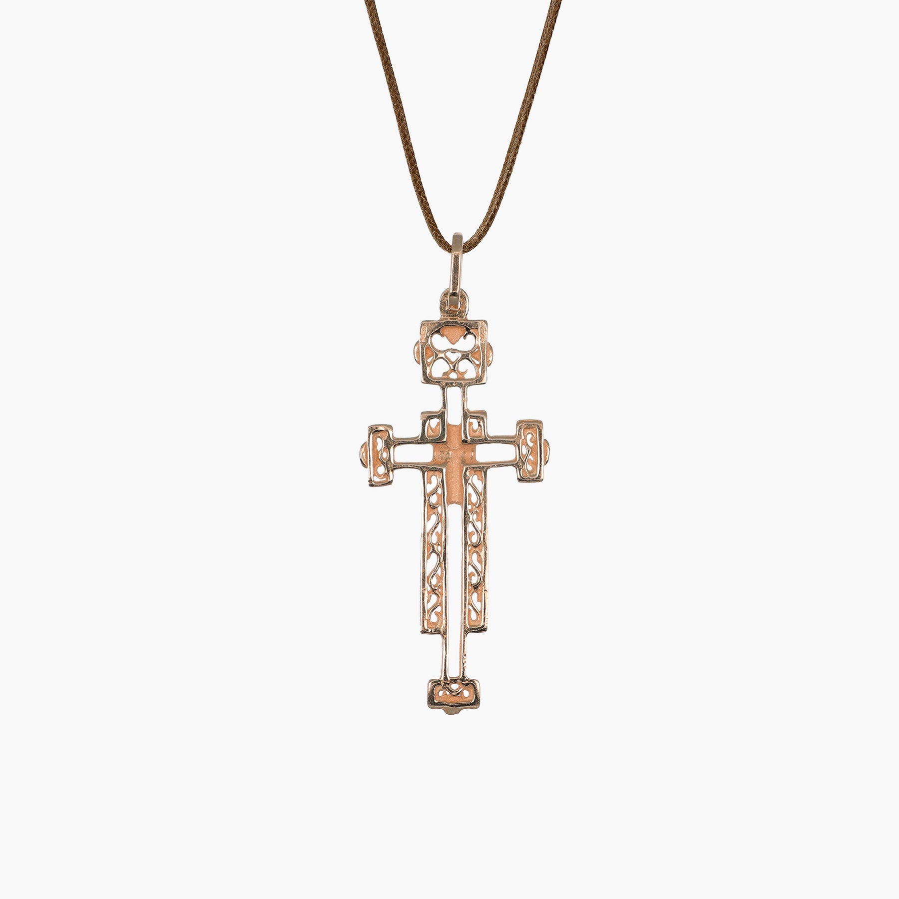 L’oro rosa, caldo e avvolgente, esalta le linee della croce e ne addolcisce il simbolismo, rendendola adatta a essere indossata ogni giorno. Non è solo un segno di fede, ma anche un oggetto personale, capace di raccontare una storia intima fatta di tradizione, protezione e memoria.